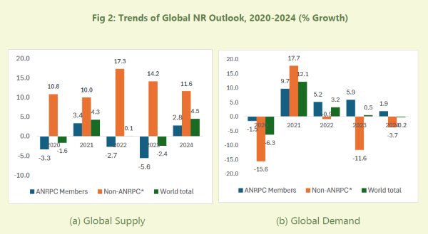 The Association of Natural Rubber Producing Countries (ANRPC) releases the Monthly NR Statistical Report, October 2024. Global natural rubber (NR) production up to the first months of the fourth quarter of 2024 reached 11.2 million tons rise 2.9% compared to the same period of previous year. Meanwhile, global NR demand reached 12.1 million tons, declined by 4.5% compared to the same period in 2023. During the fourth quarter of 2024, the NR market is predicted to experience supply disruption caused by Typhoon Yagi in China, continuing rain in parts of Thailand, and heavy rain in Sri Lanka. Based on the performance and updates from ANRPC member countries, the outlook for global NR production is revised with an anticipated annual growth of 4.5% following an update from prediction on Ivory Coast production. Similarly, the global demand growth is revised to decline 0.2% in 2024 driven by forecast revision of China’s demand and Malaysia’s demand.