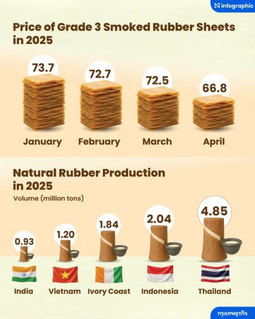 The Department of Agriculture has ordered a suspension of concentrated latex imports following farmers’ concerns over irregularities. The Department explained that Trump’s tariff hikes remain a key factor in the price decline. Meanwhile, Thailand’s rubber production in 2025 slightly decreased to 4.7 million tonnes, despite rising demand.